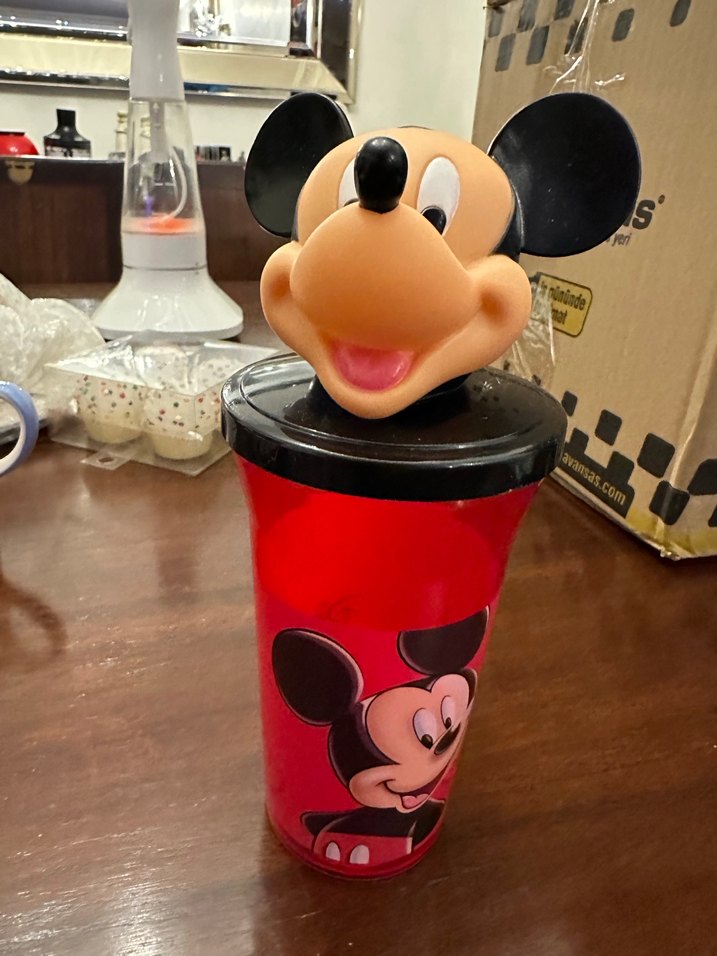 Renkli kırmızı termos şişe, Mickey Mouse teması ve 3D Mickey başlıklı kapak ile çocuklar için