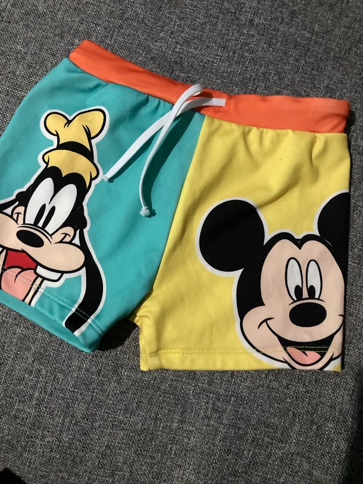Erkek çocuklar için renkli deniz şortu, büyük Mickey ve Goofy baskıları, turuncu bel bandı ve beyaz bağcık ile tamamlanmıştır. ️