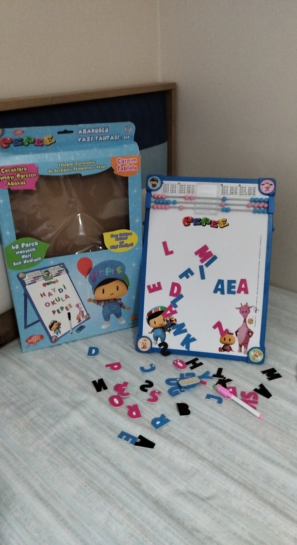 Renkli mıknatıslı harfler ve abaküsle donatılmış yazı tahtası, harfleri birleştirip sayılarla oynama imkanı sunar.