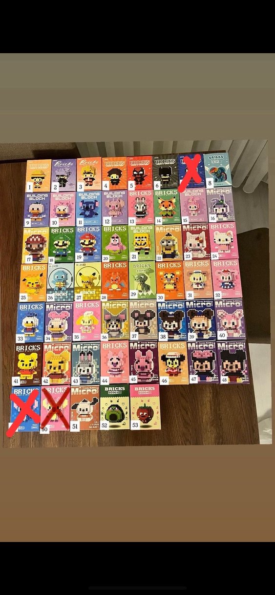 Çeşitli karakterler ve hayvanları içeren renkli mikro Lego tarzı yapboz seti.