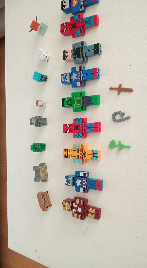 Blok tarzı detaylara sahip çeşitli karakter ve aksesuarlarla renkli Minecraft aksiyon figürleri seti.