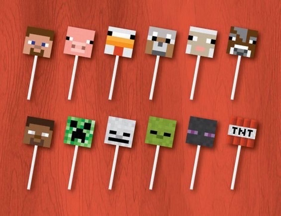 Minecraft temalı, farklı karakter yüzlerini gösteren renkli Lego figür çubukları. Piksel tarzı hayvan ve yaratık yüzleri içerir. Doğum günü pasta süsü