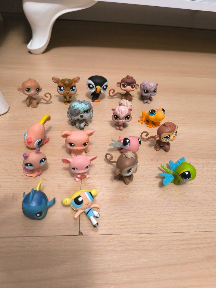 Çeşitli hayvan ve karakterlerden oluşan, canlı ve açık renklerde küçük aksiyon figürleri seti.