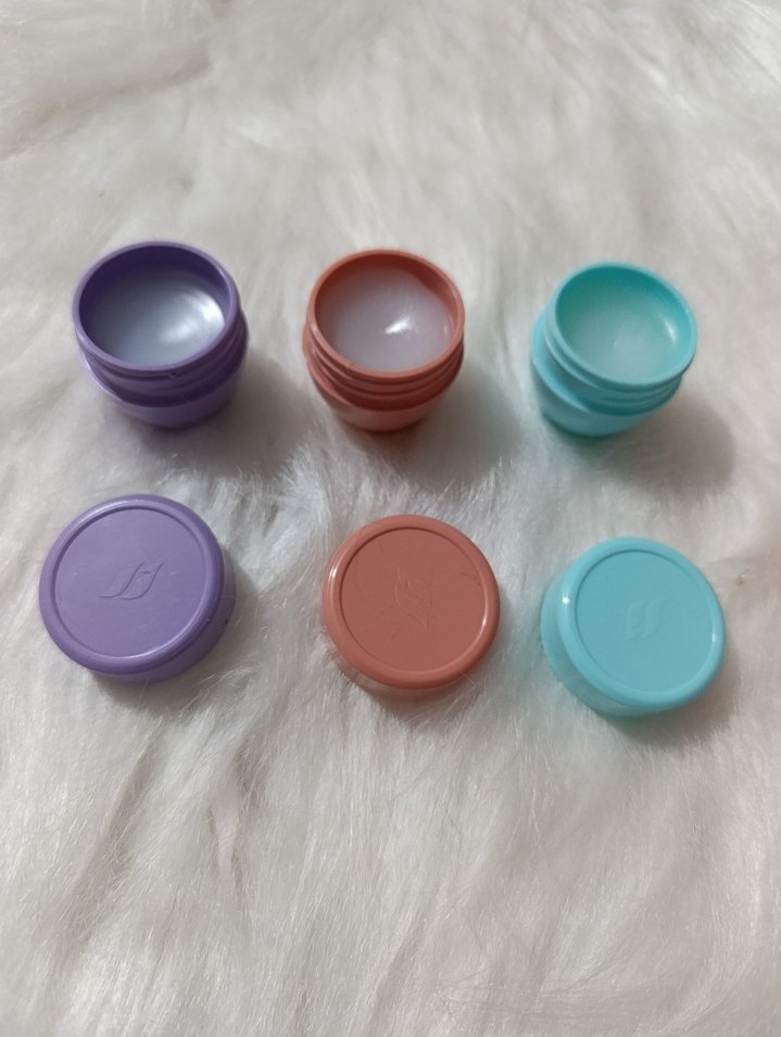 Mor, mercan ve turkuaz renklerde üç küçük balsam kabı seti, nemlendirme için uygundur. Tek fiyattır
