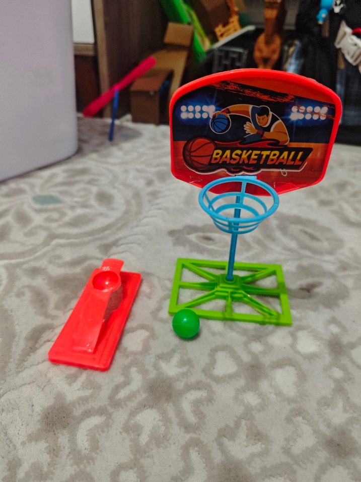 Renkli mini basketbol oyuncak seti, pota, stand ve topu fırlatmak için aparat içerir. Arkada pota figürü ve 'BASKETBALL' yazısı bulunur.