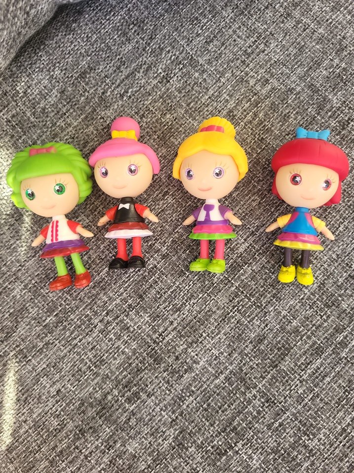 Farklı saç renkleri ve kıyafetlere sahip, yumuşak malzemeden yapılmış dört renkli bebek . hepsi tek tek gardirobumda mevcut, bu ilanı kırmızı saçlı bebek 1 ADET. ürün yurdışında alındı, kullanılmadı. 7 cm boyunda.