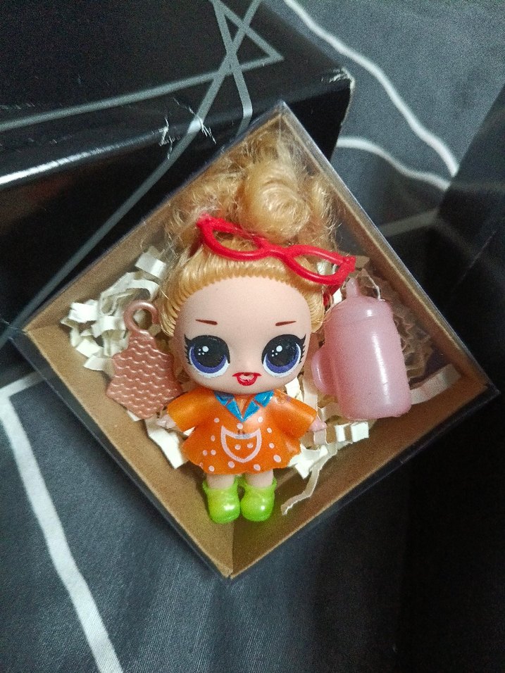 Bej tenli, turuncu kıyafetli ve yeşil ayakkabılı renkli mini bebek figürü, pembe aksesuar tutuyor. Küçük kutuda ve dekoratif kağıtla birlikte.