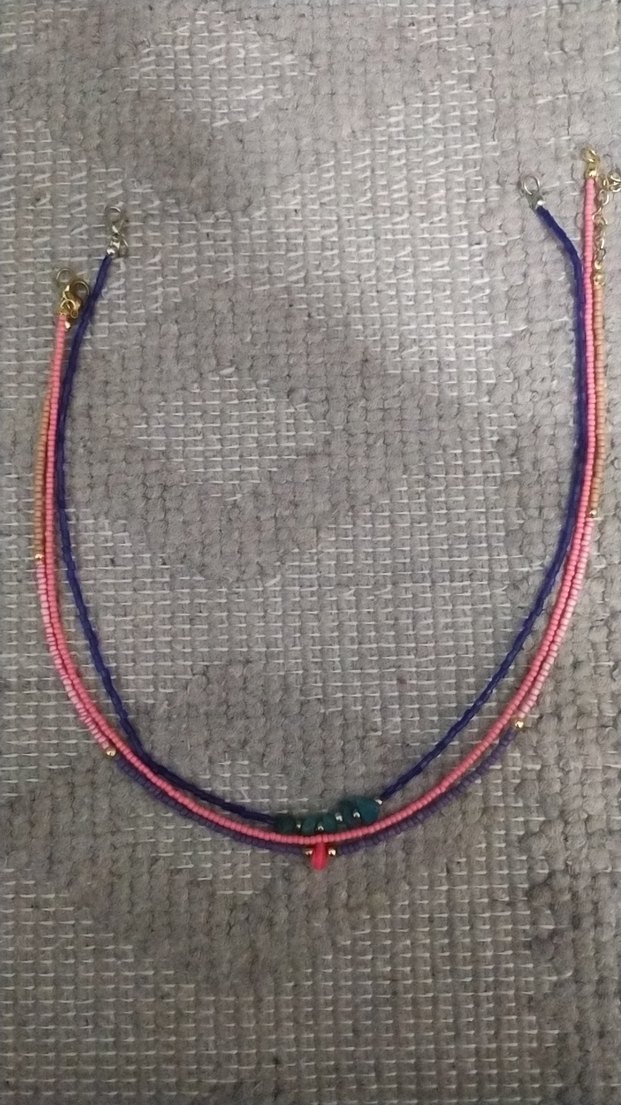 Kısa uzunlukta, renkli boncuklar ve nakış detaylarına sahip kadın kolyesi. Bohem ve minimalist tarzda, günlük kullanıma uygun, retro havasında bir aksesuar. Üç adet kolyedir. (Metal kısmında hafif kararmalar olabilir.
