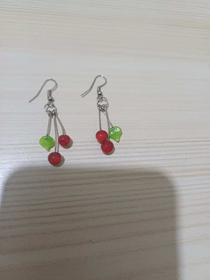 Renkli kırmızı kiraz ve küçük yeşil yaprak detaylı, kısa boncuklu küpeler, günlük kullanıma uygundur.