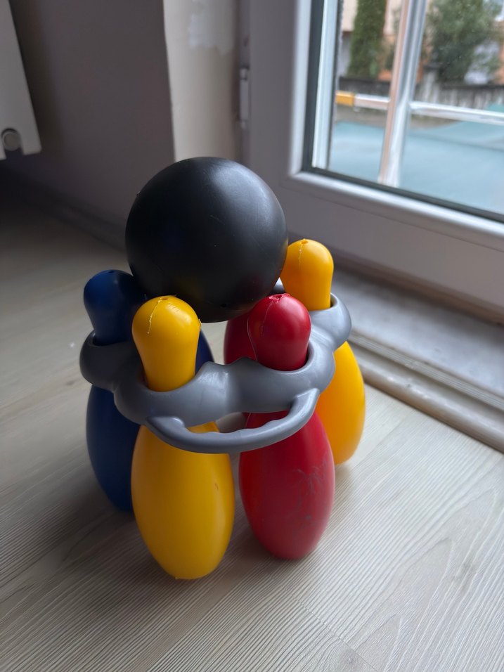 Sarı, kırmızı ve mavi küçük toplar ile siyah topu içeren renkli mini bowling seti, gri halka ile bir arada duruyor.