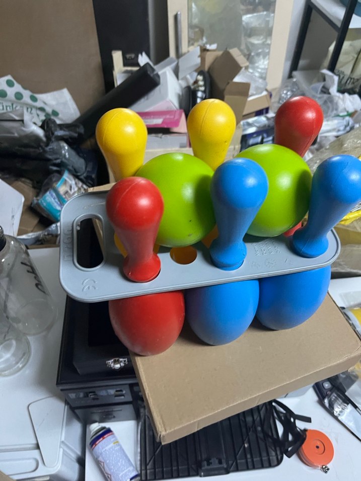 Kırmızı, mavi ve sarı renklerde toplardan oluşan renkli mini bowling seti, gri taban üzerinde yer alır.