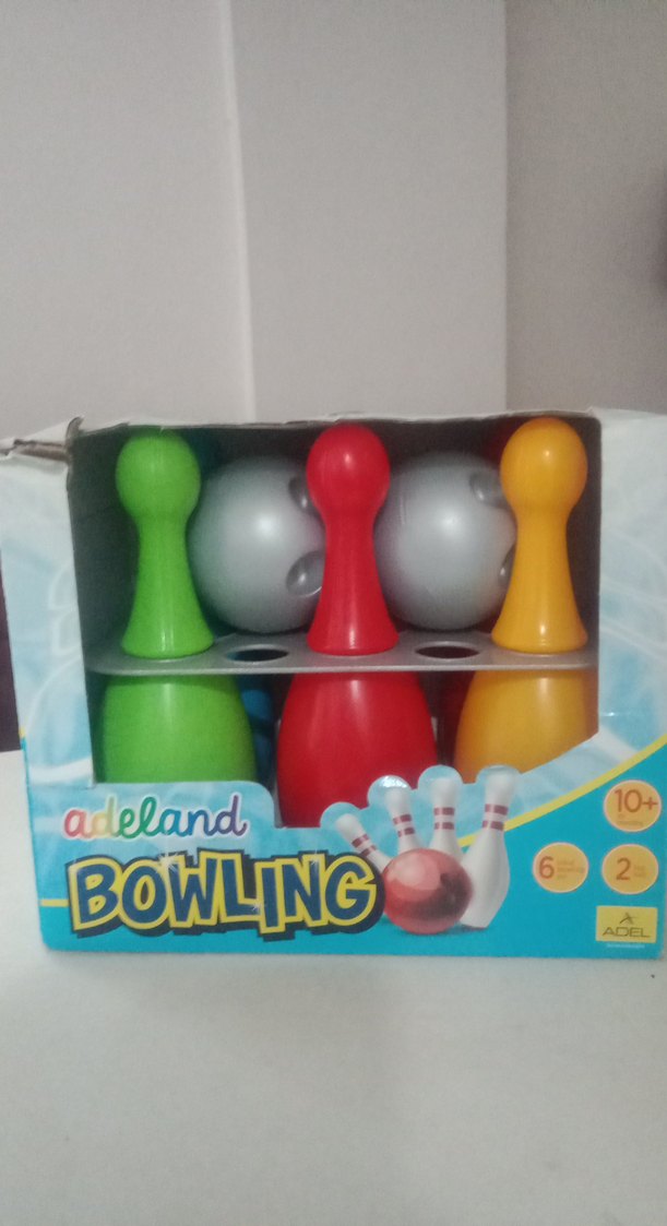 10 yaş ve üzeri çocuklar için Adeland markalı, 6 pimi ve 2 topu olan renkli mini bowling seti.