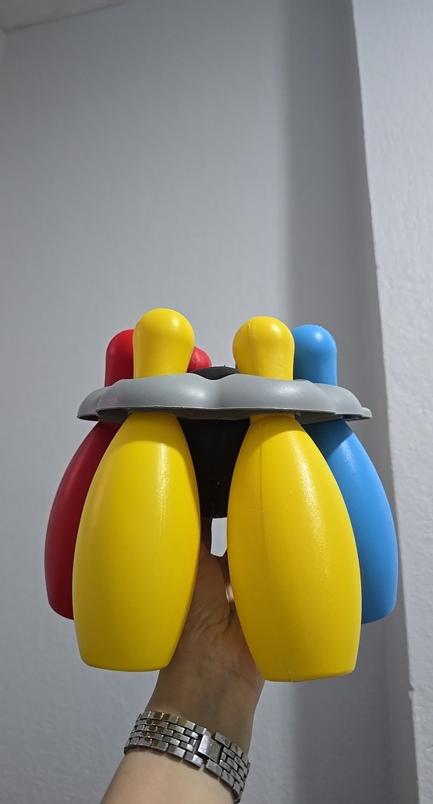 Kırmızı, sarı ve mavi plastik toplardan oluşan renkli mini bowling seti, gri bir halka ile bir arada tutulur.