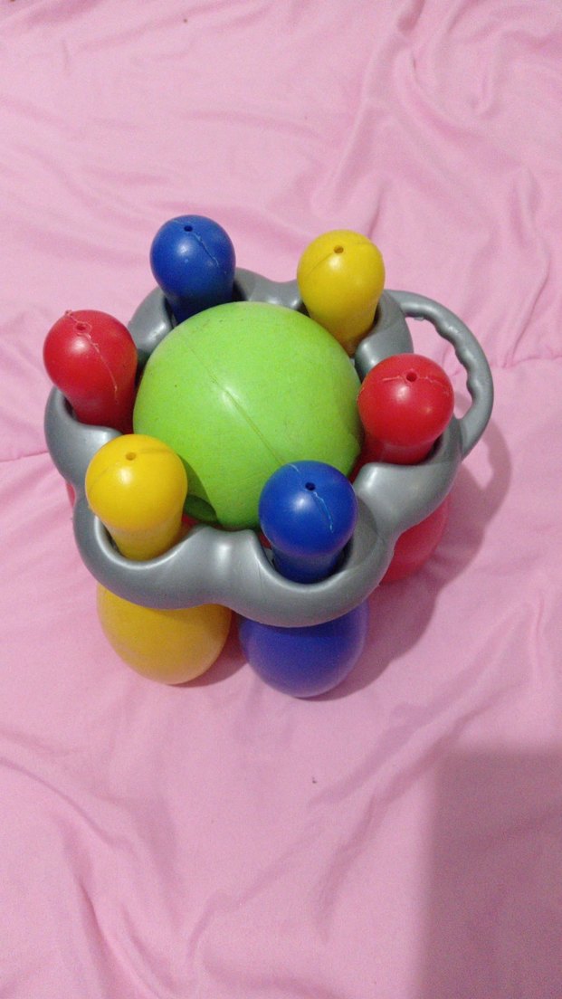 Renkli mini bowling seti, yeşil top ve kırmızı, sarı, mavi olmak üzere altı pinden oluşur, gri tutucuda yer alır.