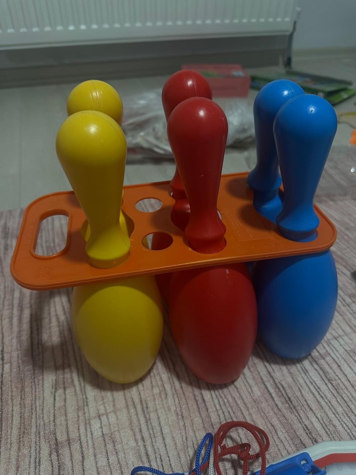 Sarı, kırmızı ve mavi renklerde toplu mini bowling seti, taşıma tepsisi ile birlikte. Eğlenceli oyunlar için ideal .