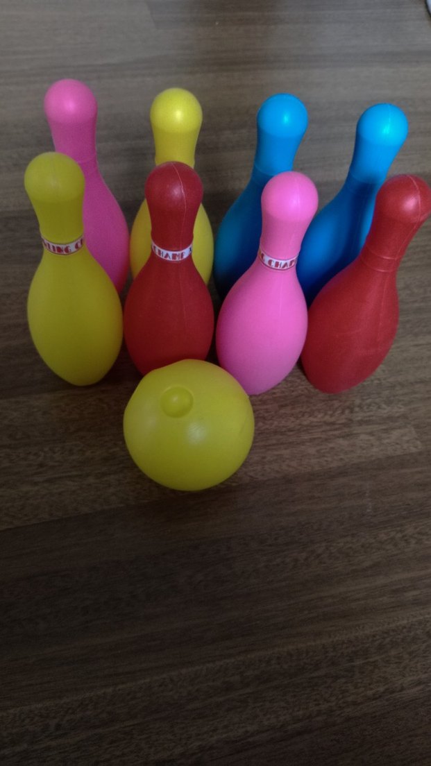 Çok renkli, hafif malzemeden yapılmış mini bowling seti. İç mekan oyunları için uygundur.
