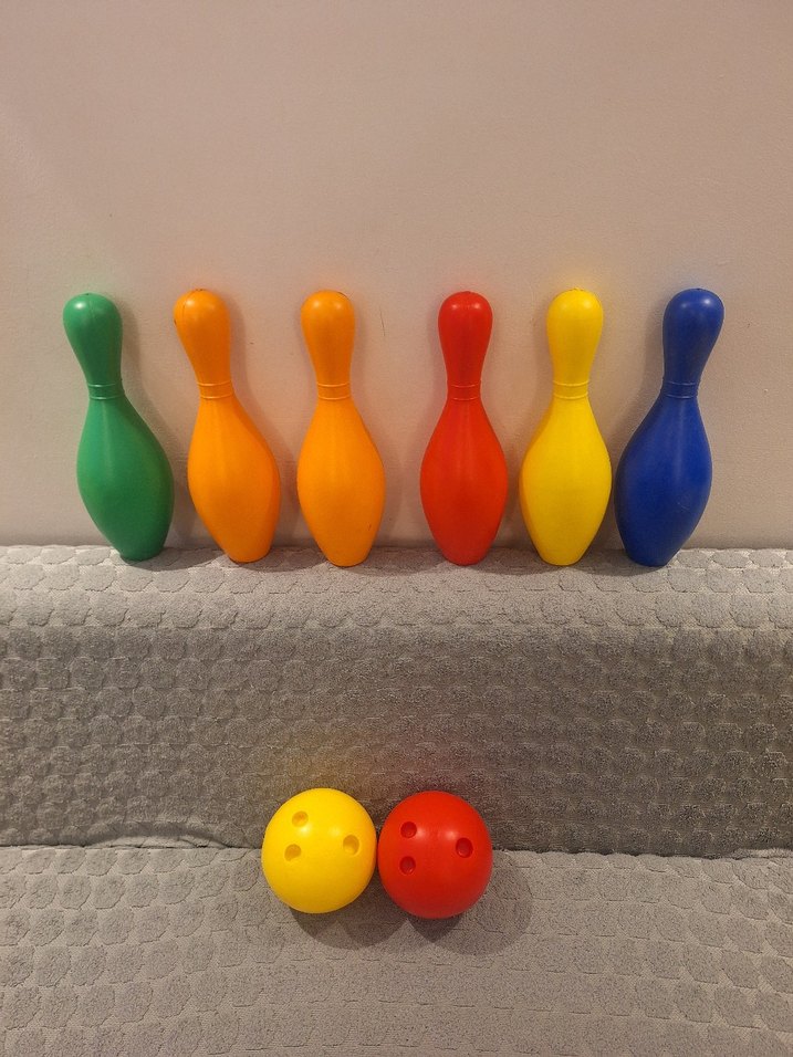 Altı renkli top ve iki top içeren renkli mini bowling seti, evde eğlenceli oyunlar için uygundur.