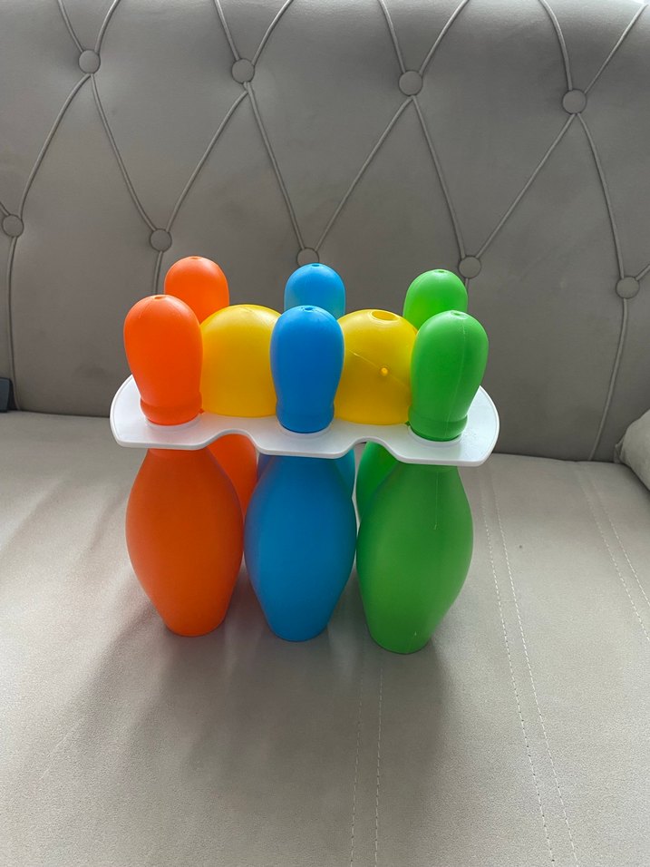 Altı renkli topa ve pinlere sahip mini bowling seti, iç mekan oyunları için uygundur. Turuncu, mavi ve yeşil pinler içerir.