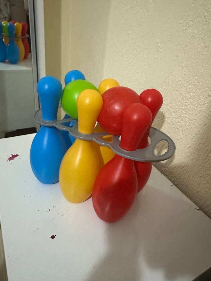 Altı renkli pin ve taşıyıcıdan oluşan hafif plastik mini bowling seti. İç mekan oyunları için uygundur.