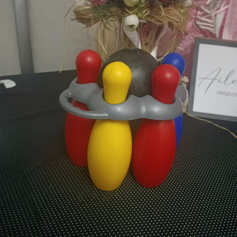 Kırmızı, sarı ve mavi toplardan oluşan renkli mini bowling seti, gri tutucu içinde yer alıyor. fotoğraf da 4 tane gözüküyor ama 6 tane bowling vardır 2 sarı 2 kırmızı 2 mavi