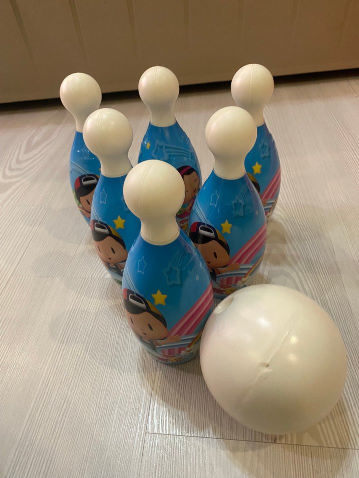 Altı adet çizgi film desenli renkli mini bowling pimi ve beyaz top içeren set, iç mekan oyunları için uygundur.