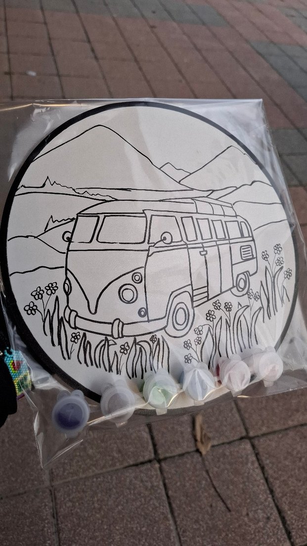 Bu mini boyama seti, klasik bir minibüs ve doğa manzarası (dağlar, çiçekler) içerir. Detaylı boyama için çeşitli renklerde küçük boyalar bulunur.