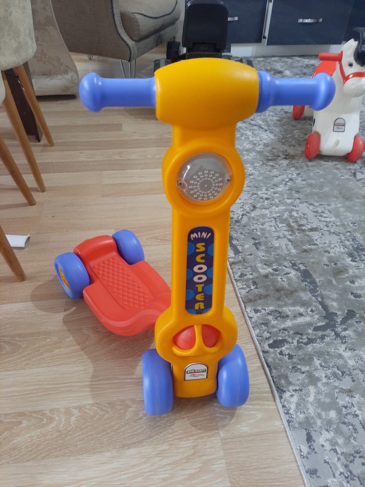 Renkli, sarı gövdeli ve mavi tutma kolları ile tekerlekli çocuk scooter'ı, küçük çocuklar için sabit taban ve kolay tutuş sağlar.