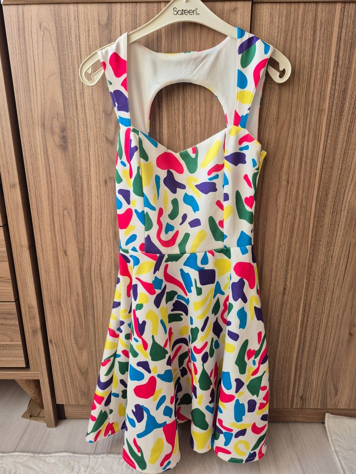 Renkli baskılı mini elbise, straplez kesim ve fırfır detayıyla parti için uygun, sentetik kumaştan üretilmiştir.