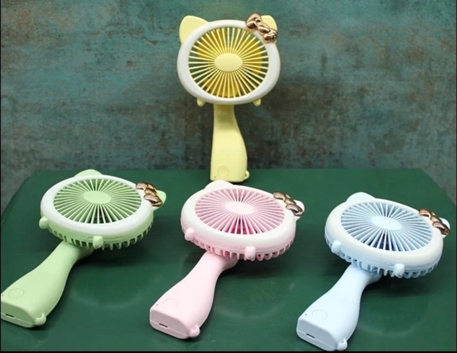 Renkli mini el vantilatörü, sevimli kurdele detayıyla kompakt tasarıma sahip. USB ile şarj edilir ve pastel tonlarda sunulur.