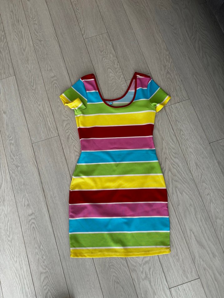 Renkli yatay çizgili mini elbise, kısa kollu ve dar kesimdir. Elastik kumaşı rahatlık sağlar, günlük kullanıma uygundur.