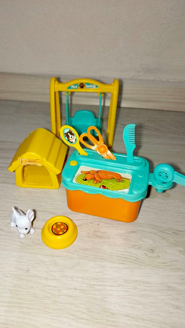 Renkli mini evcil hayvan bakım seti, salıncak, bakım araçları, küçük köpek figürü, köpek kulübesi ve mama kabını içerir.