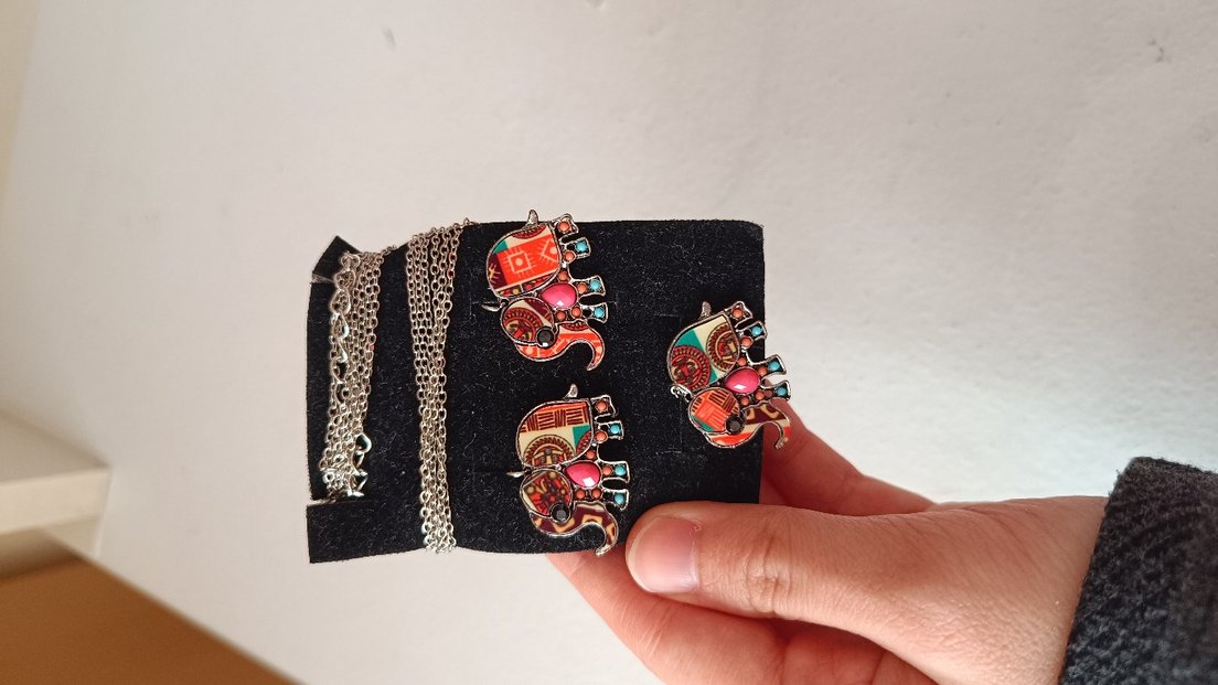 Renkli nakışlı ve payet detaylı mini fil figürlü kısa bohem kolye, günlük kullanım için uygundur. hiç bir kusuru yoktur göründüğü gibidir . ama kutusu yoktur bilginize gorseldeki gibi sadece süngeri var.