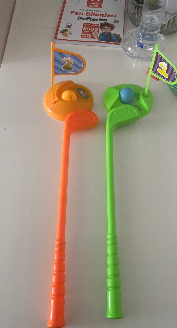 Renkli mini golf oyuncakları, iki kulüp, toplar ve numaralı bayraklar içerir. Hafif plastikten yapılmış, canlı renklere sahiptir. ⛳