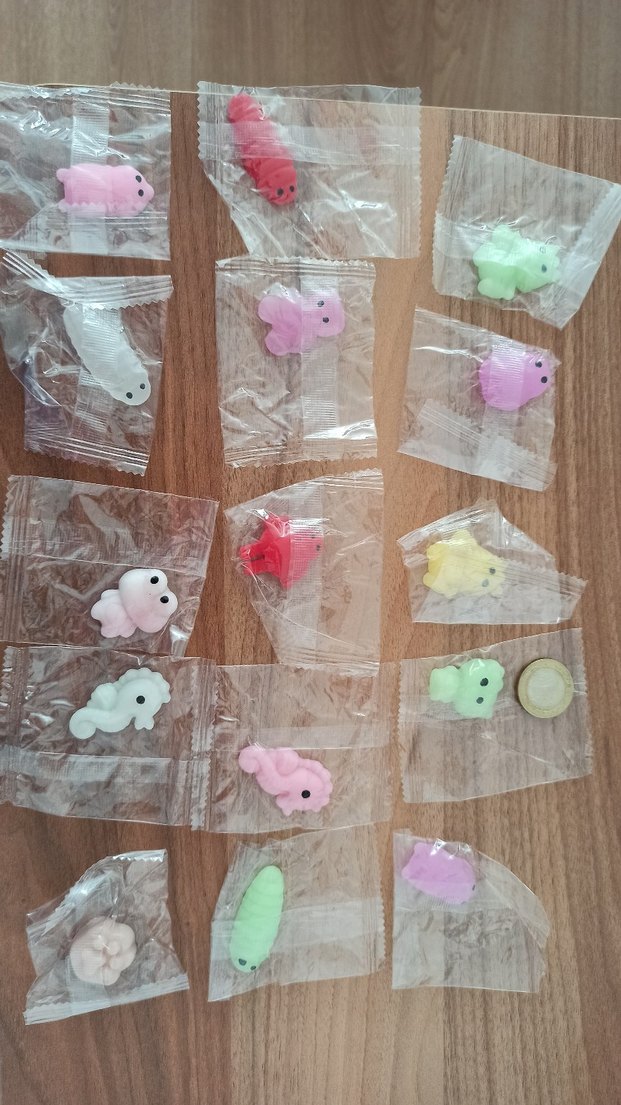Farklı pastel renklerde, plastik poşetlerde ayrı ayrı paketlenmiş küçük hayvan figürleri seti. 15 adet karışık renk ve şekilde Mochi Squishy Sevimli Oyuncak Toplu Set, Karışık Renkler Kawaii Mini Squishies Oyuncaklar Büyük çocuklar ve yetişkinler için uygundur yutulması durumunda sorumluluk bana ait değildir dikkatli olunuz