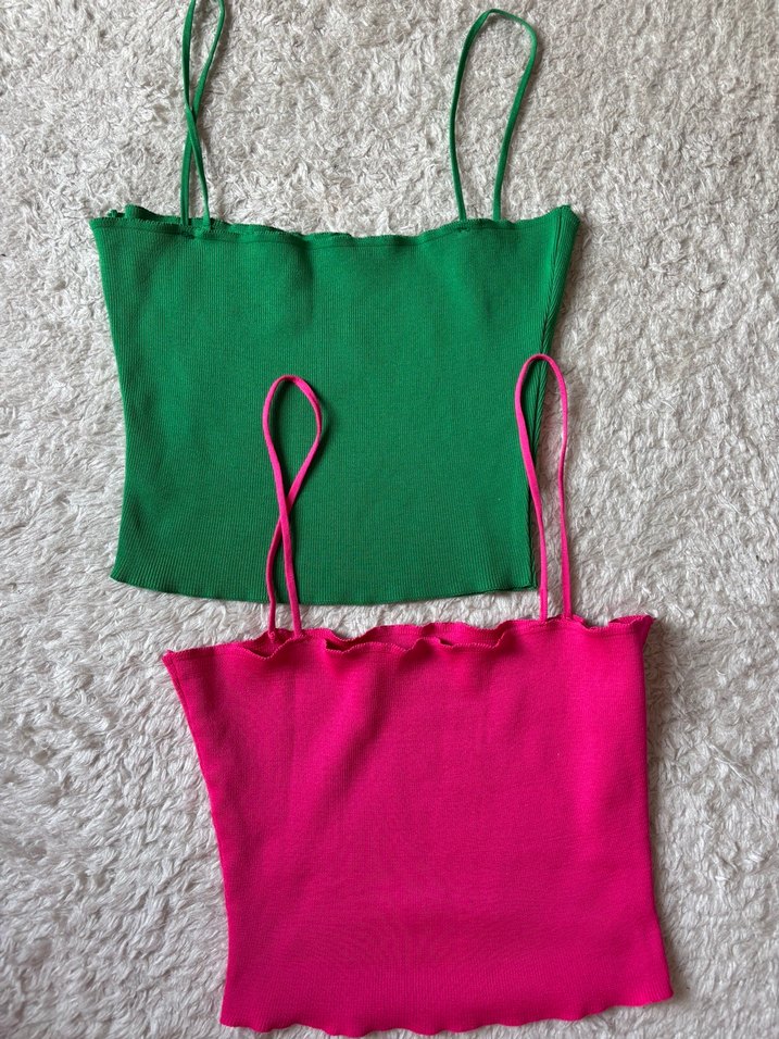 Canlı renklerde, ince askılı ve kısa kesim kadın atletleri, yumuşak sentetik kumaştan, günlük sokak stiline uygun.