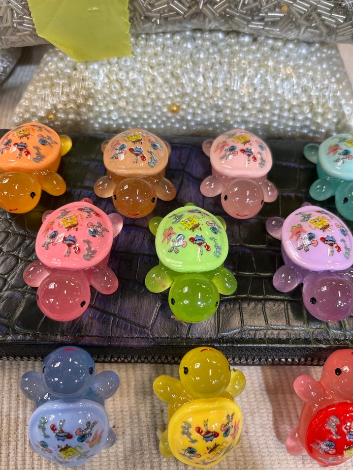 Çeşitli parlak renklerde, çizgi film desenli renkli küçük kaplumbağa magnet . Her biri yuvarlak gövde ve kollara sahiptir. Mıknatıslı ADET FİYATIDIR