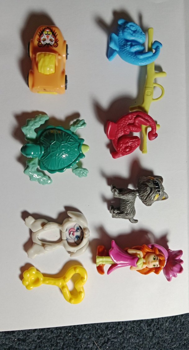 Hareketli kaplumbağa, köpek, göbeğine su dökünce havuç desenleri çıkan tavşan, yüzüklü prenses, aslan desenli mini oyuncak araba ve kırmızı, mavi renklere sahip ejderhalı denge oyuncağından oluşan set. 2. el üründür. Hiçbir kusuru bulunmamaktadır.