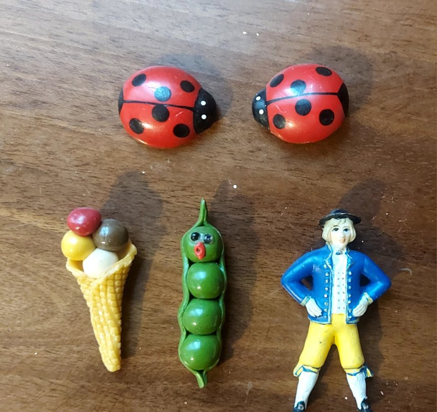 Uğur böceği, dondurma külahı, bezelye ve geleneksel kıyafetli adam figürlerinden oluşan renkli küçük buzdolabının magnet. Canlı ve eğlenceli tasarımlar.