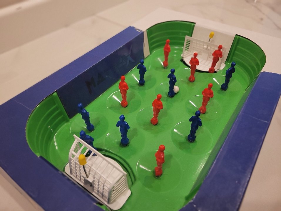 Renkli küçük oyuncu figürleriyle masa üzerinde futbol oyunu, her iki uçta kaleler bulunur. ⚽