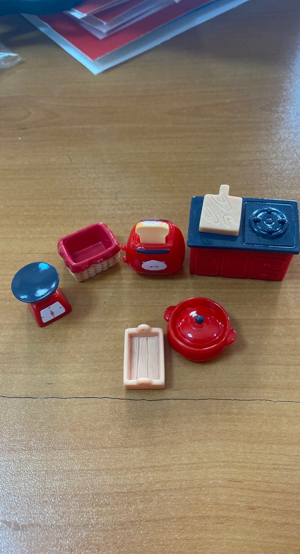 Renkli mini mutfak oyuncak seti; ocak, tencere, sepet, terazi ve kesme tahtası içerir.