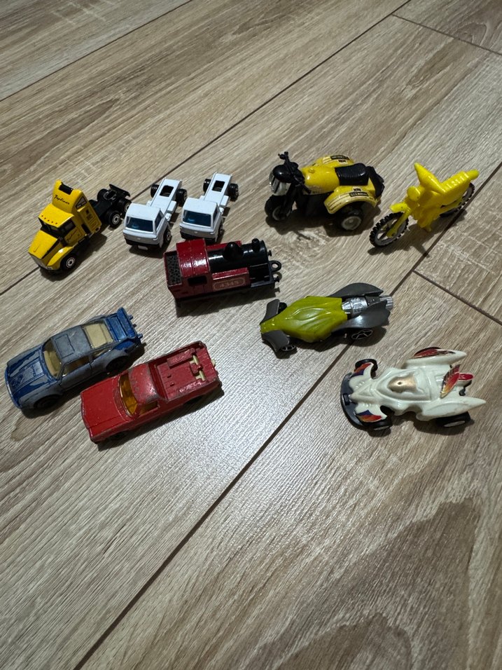 Dayanıklı malzemeden yapılmış, renkli mini oyuncak araba ve motosiklet seti, oyun ve koleksiyon için uygundur. İki araba iki spor araba iki motosiklet üç tır bir adet lokomotif‘ten oluşan çeşitli küçük oyuncak