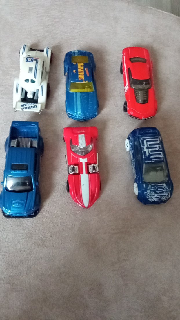 Çeşitli tasarım ve renklere sahip renkli mini oyuncak arabalar seti.