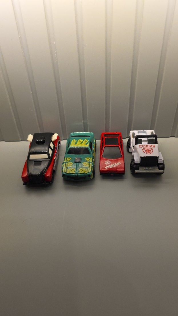 Polis arabası ve farklı tasarımlara sahip dört renkli mini oyuncak araba seti.