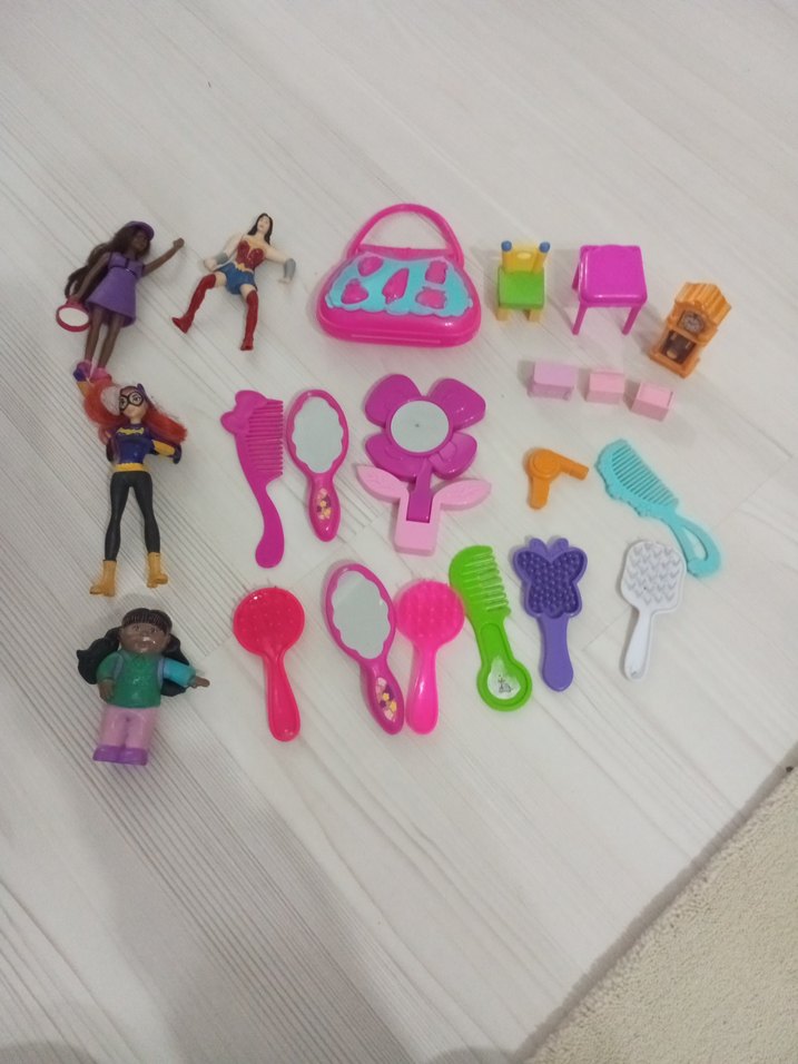 Renkli mini bebekler, taraklar, aynalar, çanta ve küçük mobilya parçaları içeren aksesuar seti. Hayal gücünü destekler.