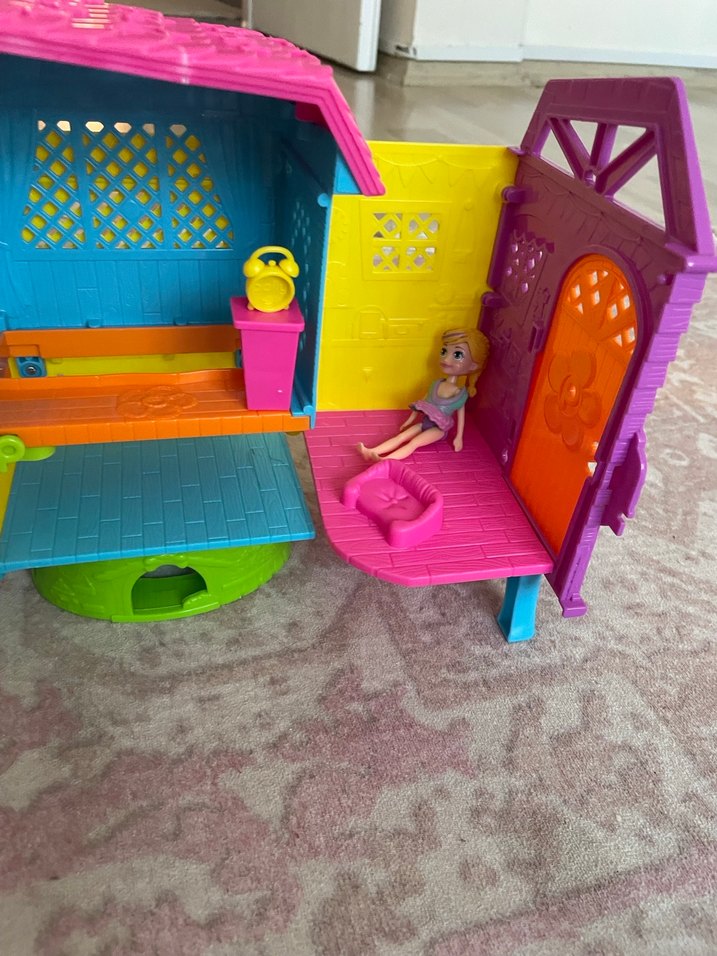 Pembe çatılı renkli mini oyuncak ev ve palmiye şeklindeki destekli mavi kaydırak. İçinde küçük figürler bulunur.