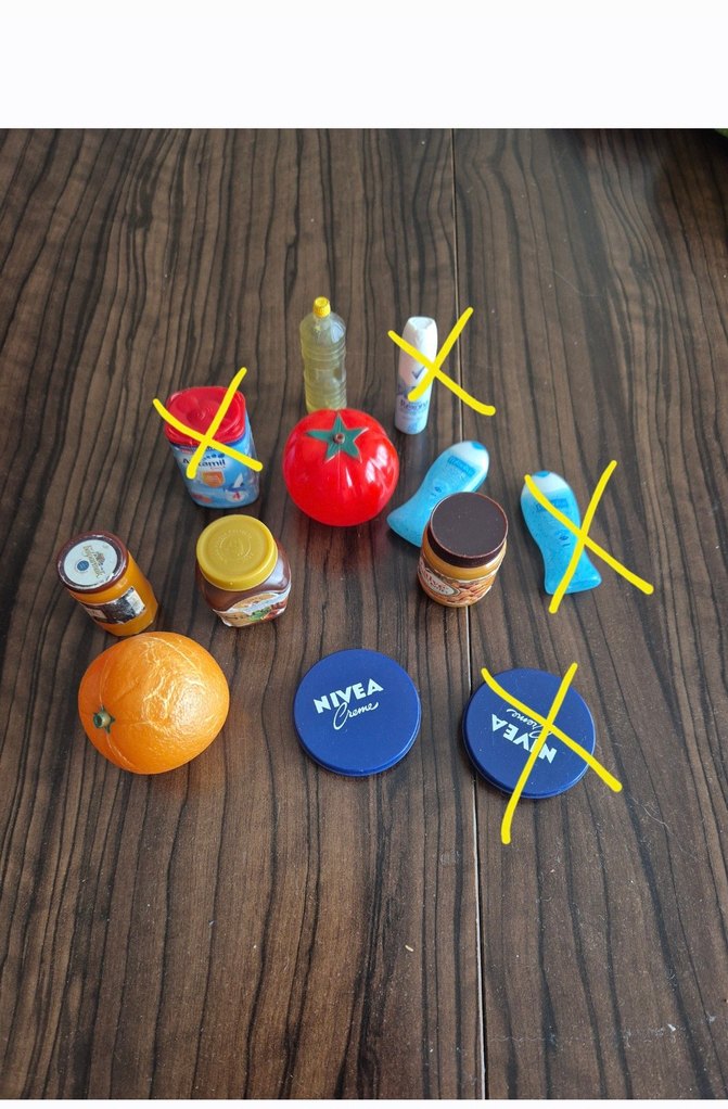 Renkli oyuncak setinde mini domates, portakal, kavanozlar, tüpler ve Nivea krem kutuları yer alıyor. Kusurları var