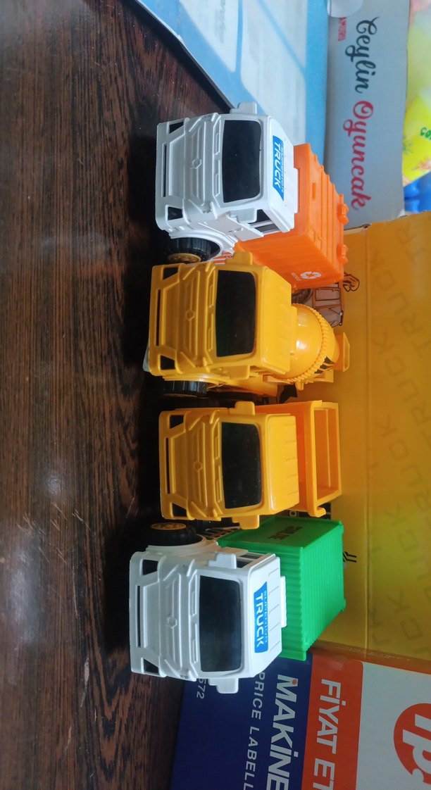 Beyaz damperli kamyon, sarı beton mikseri, sarı düz yataklı kamyon ve beyaz konteyner kamyon içeren renkli oyuncak kamyonlar. Detaylı ve canlı renklerde.