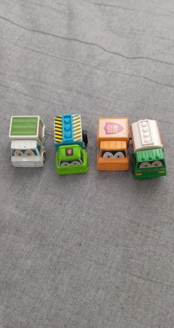 Farklı renk ve desenlere sahip, ön kısmında oyuncu gözler bulunan dört renkli oyuncak kamyon seti. Hayal gücünü destekler.