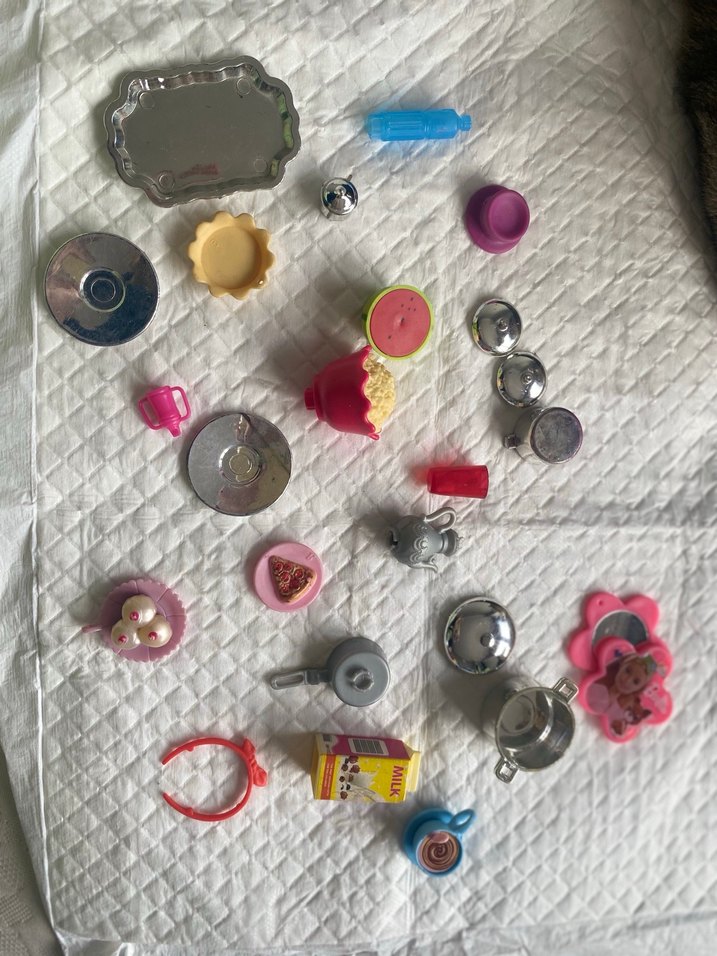 Renkli mini oyuncak mutfak seti, küçük tencere, tava, tabak ve yiyecek parçaları içerir. 3 parça 50 tl hepsi gerçek miniş ve barbie malzemeleri