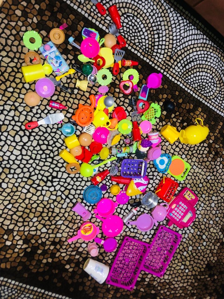 Çeşitli küçük mutfak gereçleri ve aksesuarları içeren renkli mini oyuncak mutfak seti. Hayal gücünü destekler.